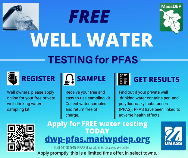 MassDEP is offering private well owners an opportunity to receive free testing for PFAS compounds in communities where 60% or more of the consumers use private wells, like Shelburne. The link to apply for free sampling is https://dwp-pfas.madwpdep.org. For more information about the program, see their FAQ (https://www.mass.gov/doc/frequently-asked-questions-about-the-massdep-private-wells-pfas-sampling-program/download).